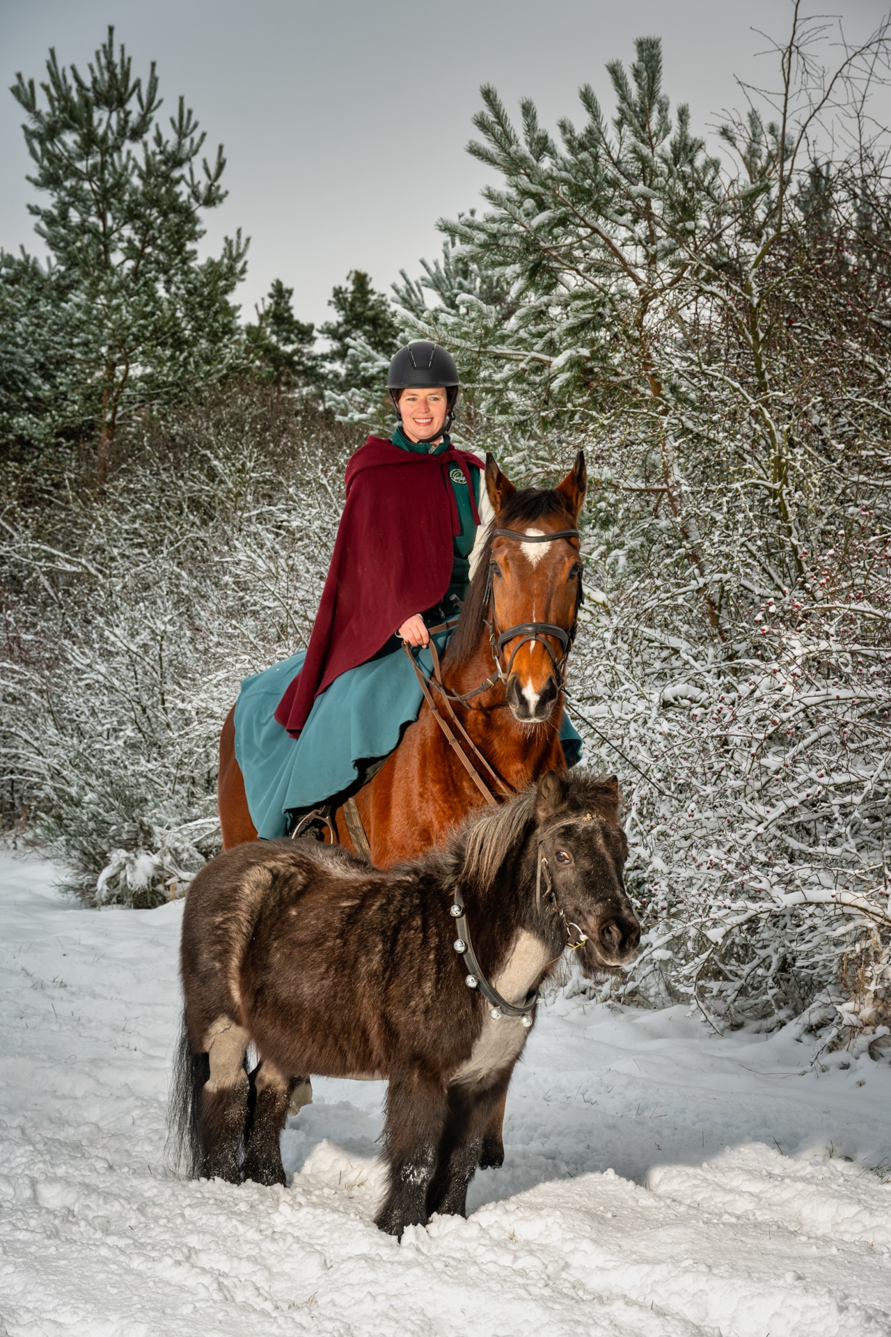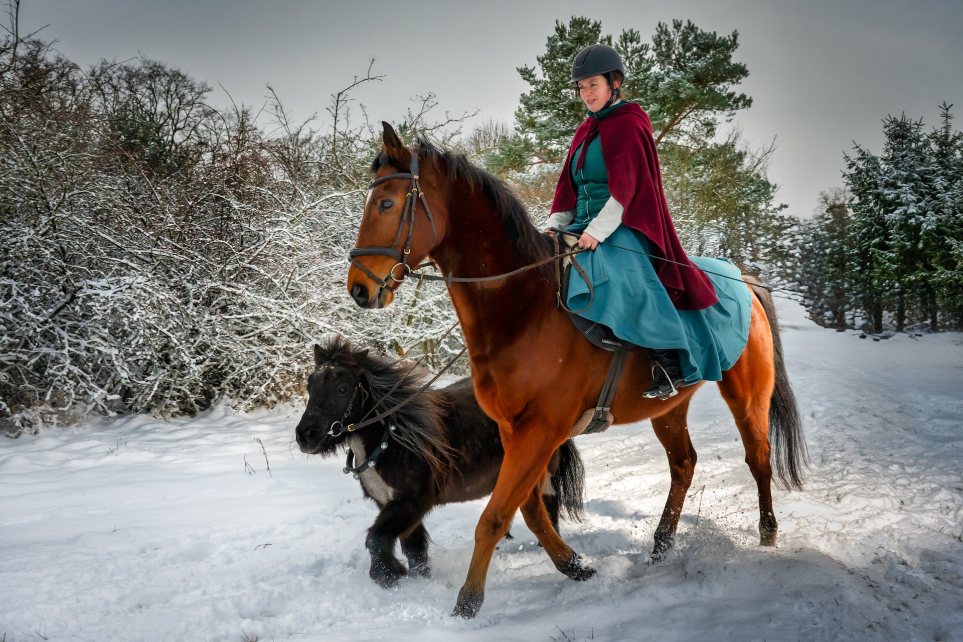 Die kalte Winterluft umhüllte die Reiterin und ihr Pferd, während leise Schneeflocken auf die Mähne der Tiere fallen.